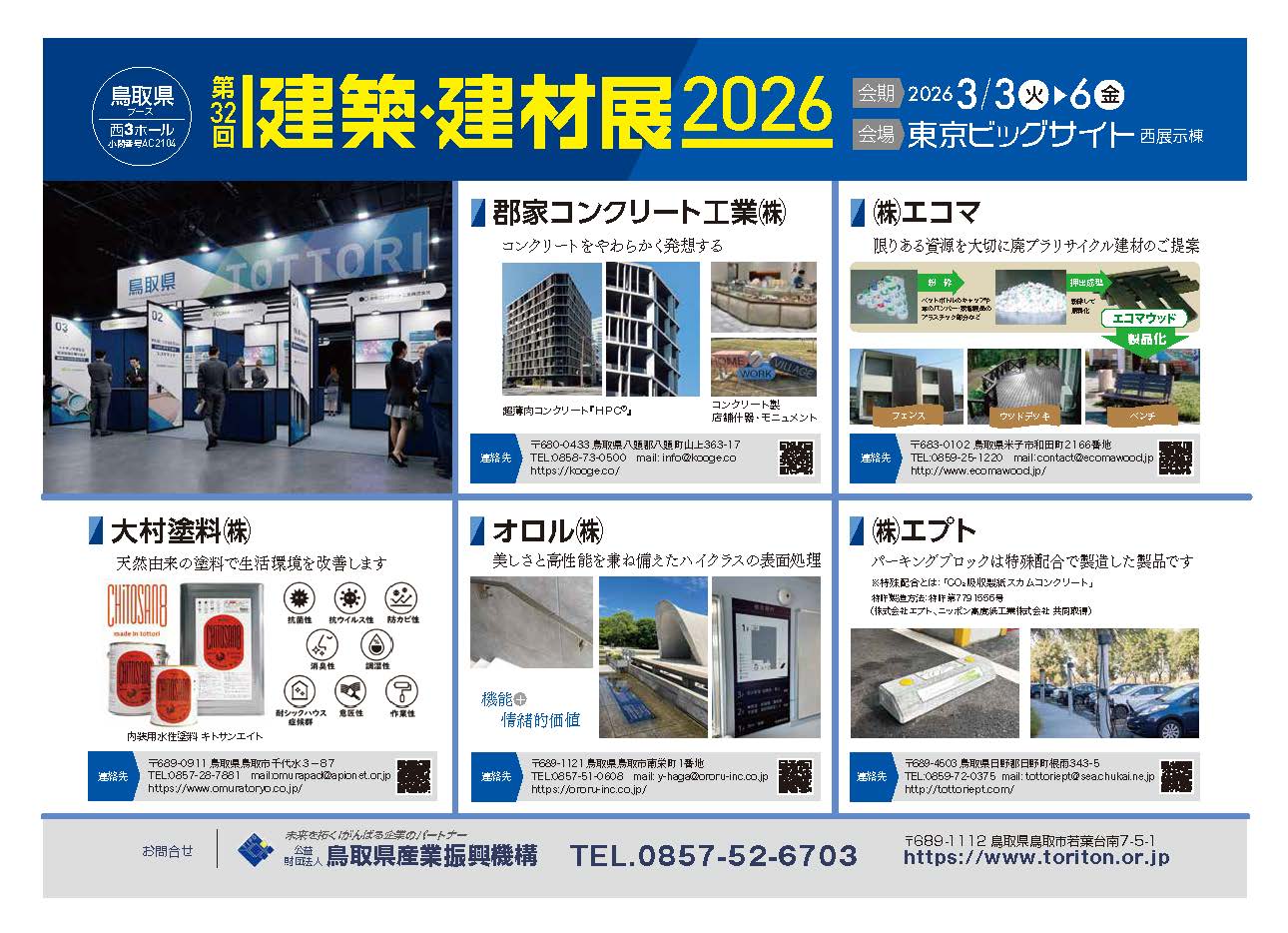 (公財)鳥取県産業振興機構では、令和8年3月3日(火)から3月6日(金)まで開催される「建築・建材展2026」に出展します。