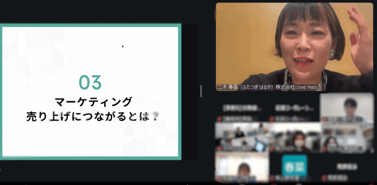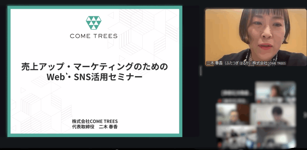 講師には株式会社COME TREES 代表取締役 二木 春香 氏をお迎えし、中小企業様でも無理なく取り組めるSNS・WEB活用のポイントを、実際の成功事例を交えながら分かりやすくお話いただきました。