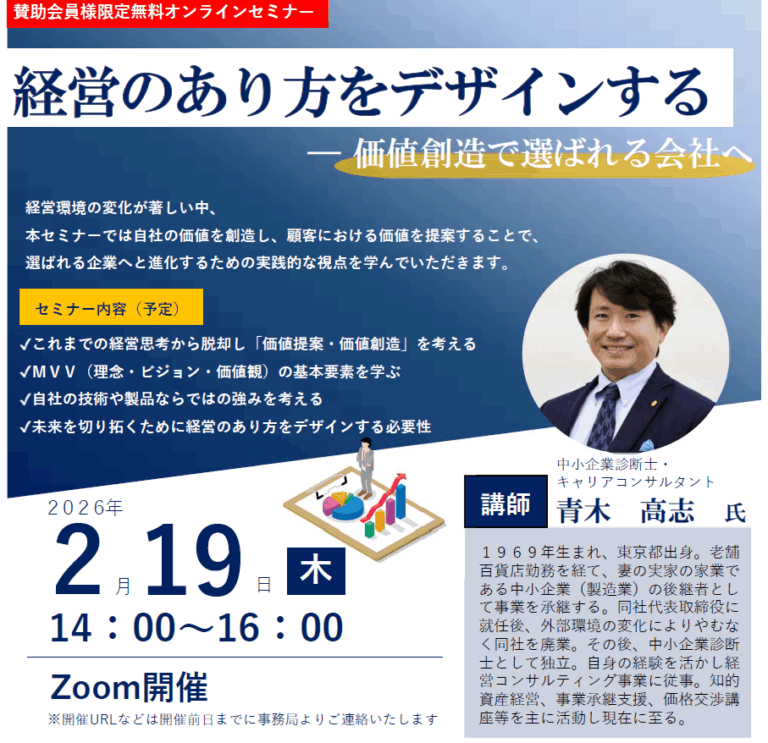 【賛助会員様限定 無料オンラインセミナー】「経営のありかたをデザインする-価値創造で選ばれる会社へ」(2/19開催)