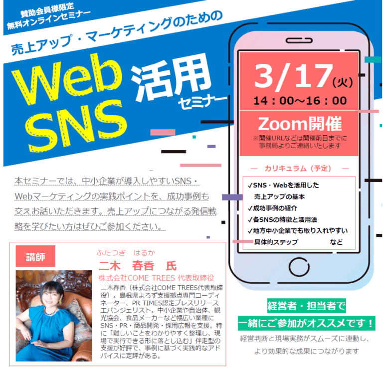 【賛助会員様限定 無料オンラインセミナー】売上アップ・マーケティングのためのWEB・SNS活用セミナー(3/17開催)