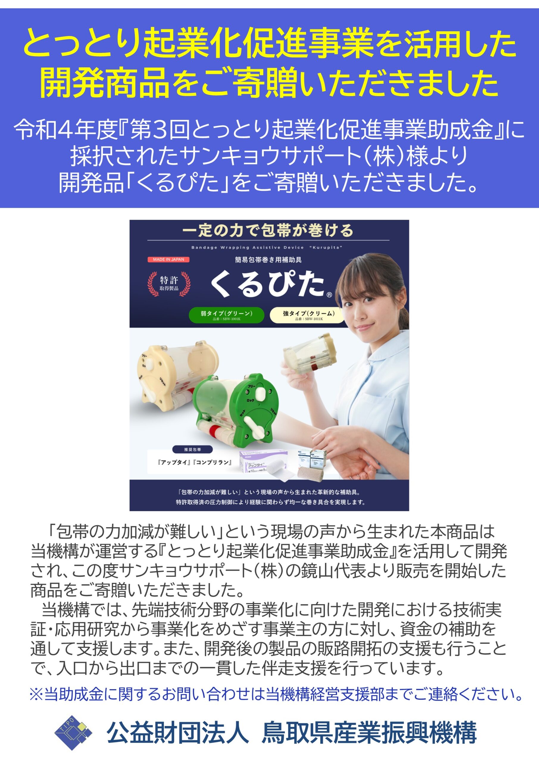 「包帯の力加減が難しい」という現場の声から生まれた本製品は、令和4年度第3回とっとり起業化促進事業助成金に採択され、当機構が助成金を通して開発支援を行いました。